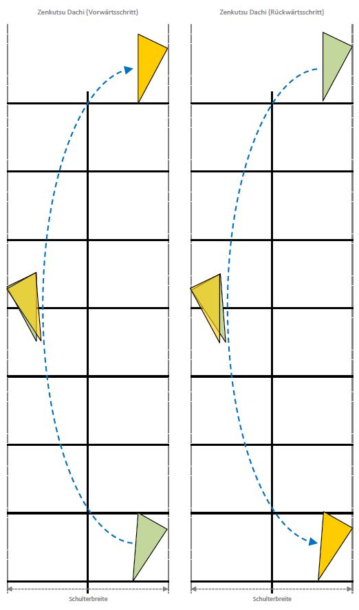 Wie stehe ich richtig? Die Füße befinden sich von vorn betrachtet etwa schulterbreit auseinander (wie beim Heiko Dachi). Der vordere Fuß befindet sich dabei etwa zweieinhalb (2 ½) Fußlängen vor dem anderen Fuß. Das vordere Knie wird nach vorn gebeugt, so dass es sich im Bereich über dem Mittelfuß bis zu den Fußzehen befindet (Lot des Knies mittig über dem Fuß/den Zehen), das hintere Bein bleibt nahezu gestreckt. Es ist darauf zu achten, im vorderen Knie eine leichte Spannung zu halten, damit es nicht zur Seite kippt. Beim Zenkutsu Dachi zeigen beide Füße nach vorn (Innenseite der Füße parallel zur Standrichtung) und das Gewicht sollte möglichst so verteilt sein, dass es zu ca. 60% durch das vordere Bein getragen wird. Zur Stabilität ist es ebenso wichtig, die Hüfte nicht einzudrehen, sondern dass sie nach vorn zeigt. Dabei wird das Becken leicht nach vorn gekippt und unter Spannung gehalten.